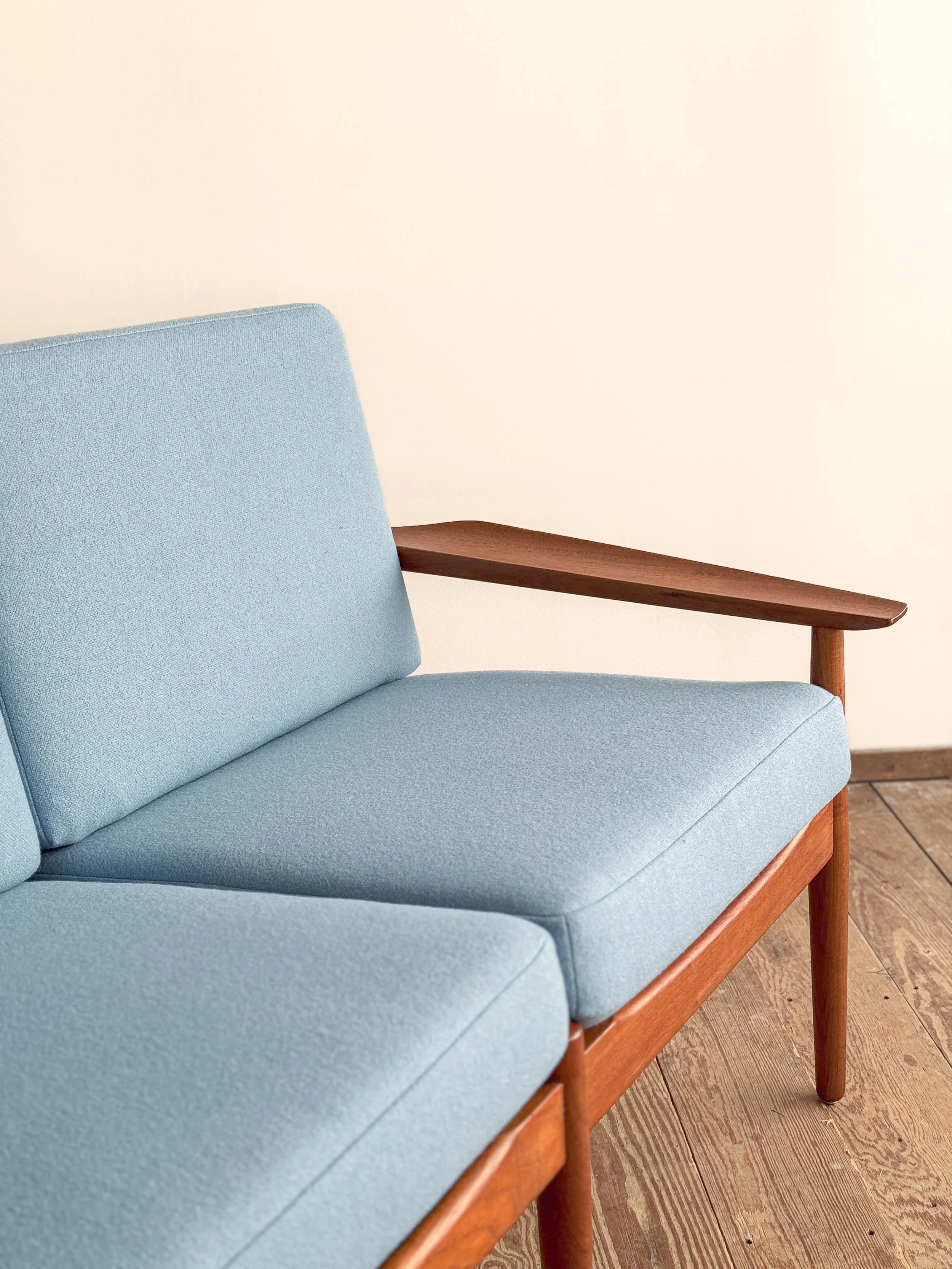 Dieses skandinavische Designer Sofa aus dem Hause Glostrup wird Arne Vodder zugeschrieben. Das Sofa wurde aus massivem Teakholz in Dänemark gefertigt. Die neuen Schaumstoffkissen sind mit einem hochwertigen Wollstoff-Stoff des Dänischen Premiumherstellers Kvadrat bezogen.